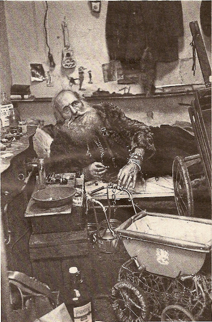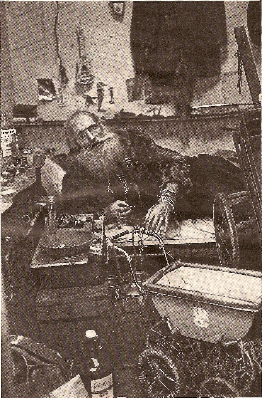 William Mack is known as the Sage of the Wilderness, the (Abominale) Snowman, Santa Claus, El- Dorado, Rasputin, Daniel Boone, Garabadi. Mr. Mack lives on Third Avenue in a room which measures about 7 by 8 feet, with nine umbrellas, a cowbell, twenty rings, 5 hammers, 38 cigar butts in a bowl, 11 bracelets, 4 watches, 3 earrings, 6 necklaces, 35 empty bottles, a Hopalong Cassidy gun and holster, a wagon, 46 rolled-up pieces of string, 19 brushes for hair, shoes, Paint or floor, 5 segments of broken mirror, a pink doll carriage with a sort of underslung hammock devised out of more string, a jar full of plastic umbrella tips, 5 canes, some Blue Seal pomade, 6 saws, 7 pairs of scissors, a jar of Maraschino Cocktail Cherries, a medicine dropper, a squashed coffeepot, 2 pinup pictures of Sophia Loren and 1 each of Brigitte Bardot and Julie Newmar, 9 belts, a pair of brown child’s shoes hanging by the laces, a bogus detective badge, 8 augers, a foxtail, a copy of the Koran and a Holy Bible, a 1959 Horoscope, a ladder, a Guide To Sexual Harmony In Marriage, ( Mr. Mack has never married), 9 pliers, 10 screwdrivers, An English-Arabic Dictionary, a pair of white nurse’s shoes, 7 paint scrapers and some Breath O’ Pine All Purpose Cleanser. (“Three months living here and I’m still straightening up”). When people ask him why he collects so many things his favourite answer is to say it’s good for his rheumatism and when people ask him where he was born he likes to say In the kitchen: He could tell because he heard the water running. He is 72 years old, German, an ex-merchant seaman living on his pension.